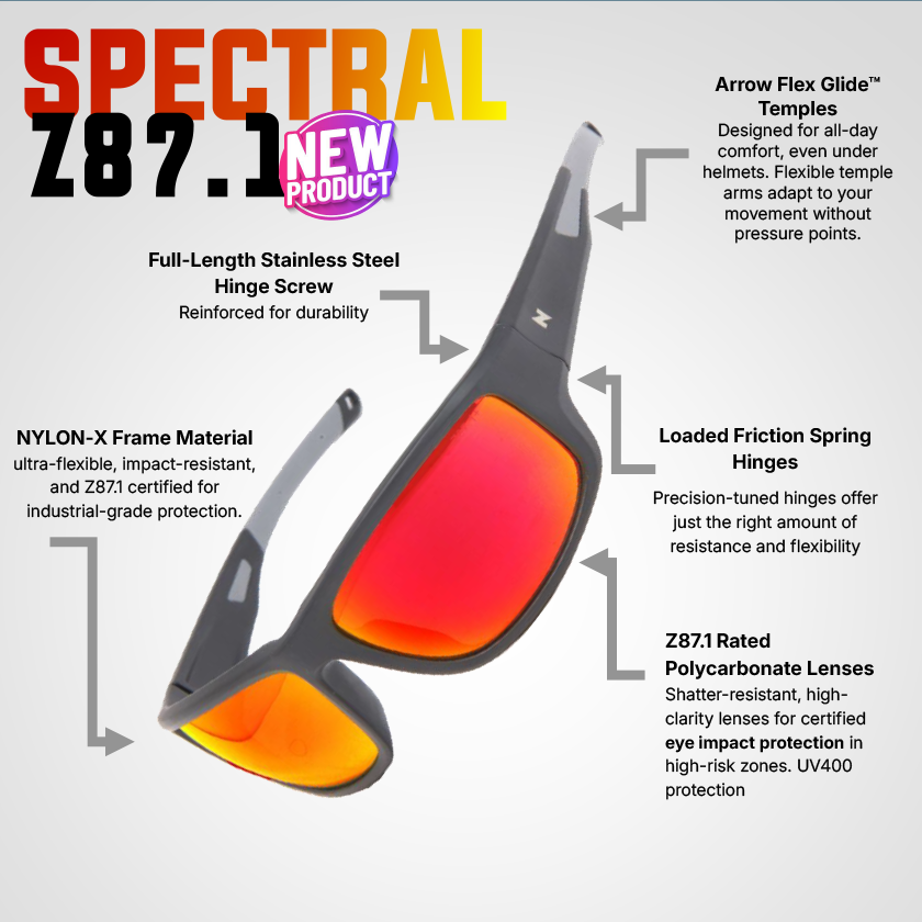 Engineered for the harshest environments, the new Spectral Z87.1 safety eyewear is forged with our NYLON-X frame — ultra-flexible, ultra-tough, and fully Z87.1 certified. Designed with Arrow Flex Glide temples for helmet compatibility and all-day comfort. Featuring Z87.1-rated polycarbonate lenses, a full-length stainless steel hinge screw, and a friction-loaded spring hinge, Spectral delivers elite durability with seamless function.